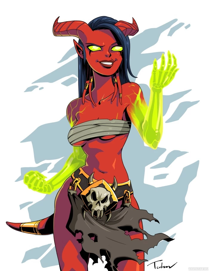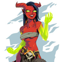 a black top with some sort of skull emblem, possibly indicating she may be from an underworldly realm. The background has a textured look with what seems to be flames or