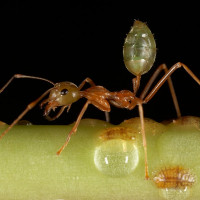 The image shows an ant walking along the surface of a freshly emerged young