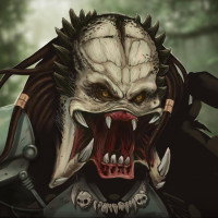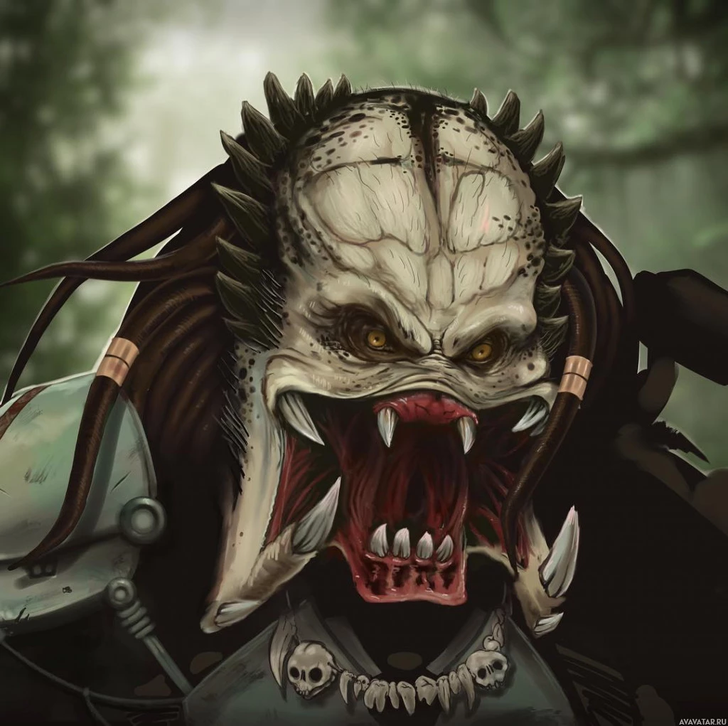 alien creature is known for its distinctive mask and armor, which are depicted here. The Predator's mask covers much of its face, showing only glowing