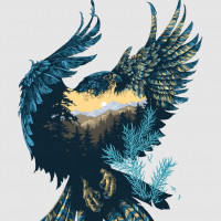 The image depicts a stylized illustration of an eagle. The bird is shown in mid-flight with its wings spread wide, showcasing the detailed