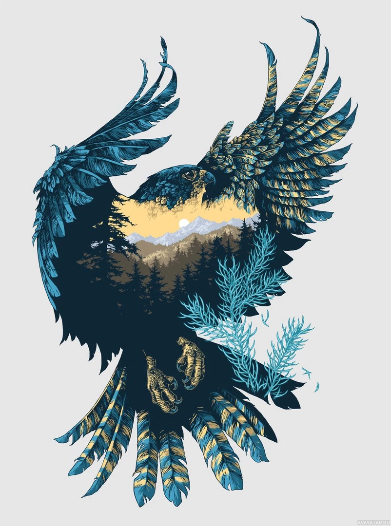 feather patterns and colors that are typically associated with this species. In the background, there appears to be a landscape featuring what looks like a forest and mountains under a sky with