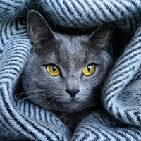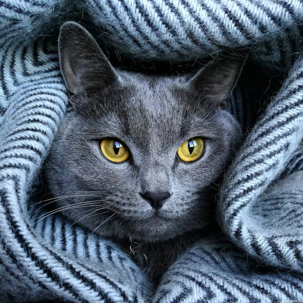 На картинке изображена серая кошка, частично укрытая чем-то похожим на одеяло или шарф в полоску. Кошка выглядывает из-под материала, и ее глаза открыты, что придает ей настороженный вид.