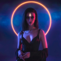 light effect surrounds her head, creating a dramatic and ethereal atmosphere. The background has a bluish-