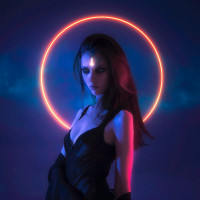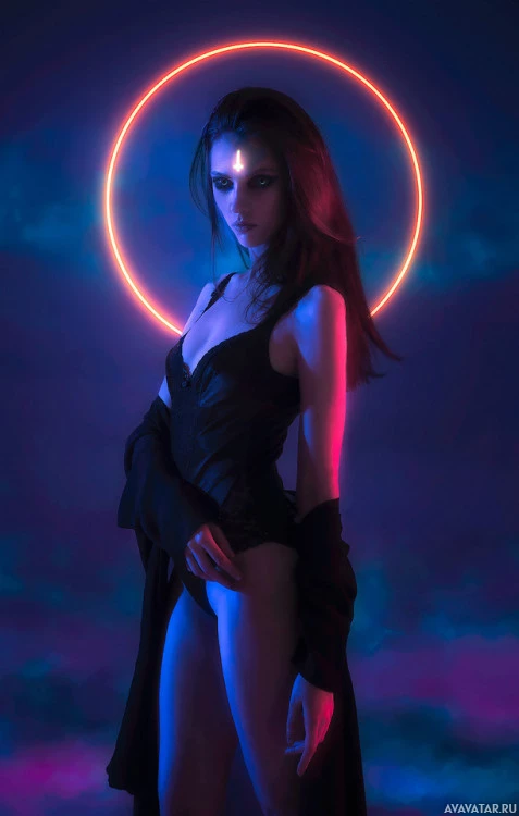 an illuminated circle around her, which could be interpreted as a visual representation of a "halo." The overall theme of the image appears to be related to