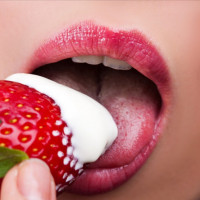 На снимке изображен человек, облизывающий клубнику. На клубнике также есть сливки или взбитые сливки, что является распространенным способом насладиться ими в качестве десерта или закуски.