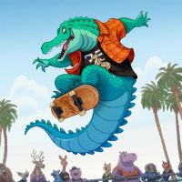 a cheerful expression and wears a colorful jacket over a black t-shirt with some designs on it. In the background, there are several other cartoon animals looking on at the spectacle, including what appears to be a lion with
