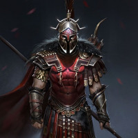 intricate designs that suggest a high level of craftsmanship. The character also holds what appears to be a spear or lance in one hand, which is consistent with the warrior's role. The setting seems to be a moody, possibly battle-torn environment, indicated by the dark color palette and