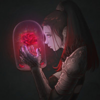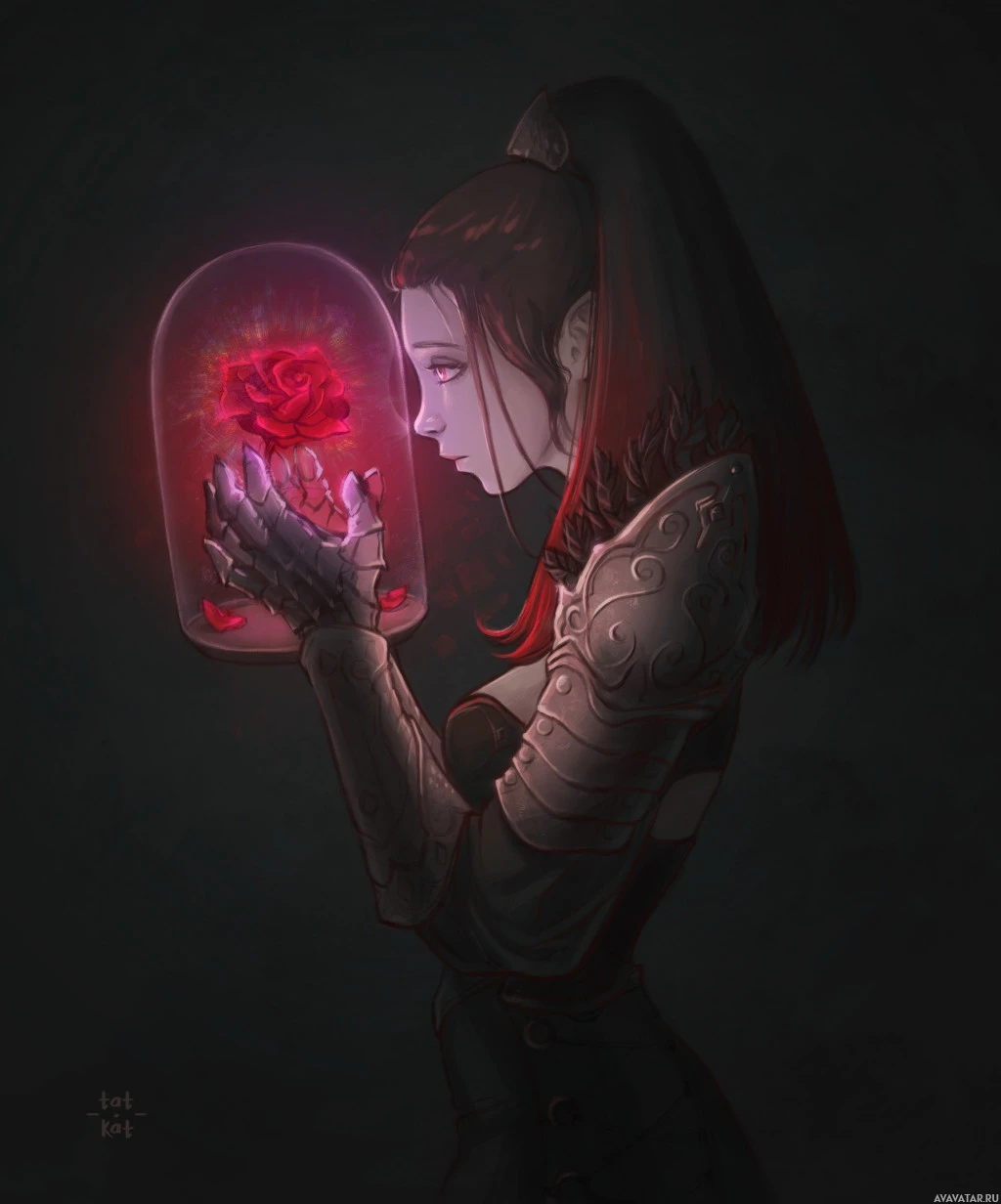 a glass jar containing a single rose that has a dark, ominous glow around it. This could be interpreted as a supernatural or fantastical element in the artwork, possibly suggesting themes of magic, mystery, or danger. The overall atmosphere of the image seems to convey