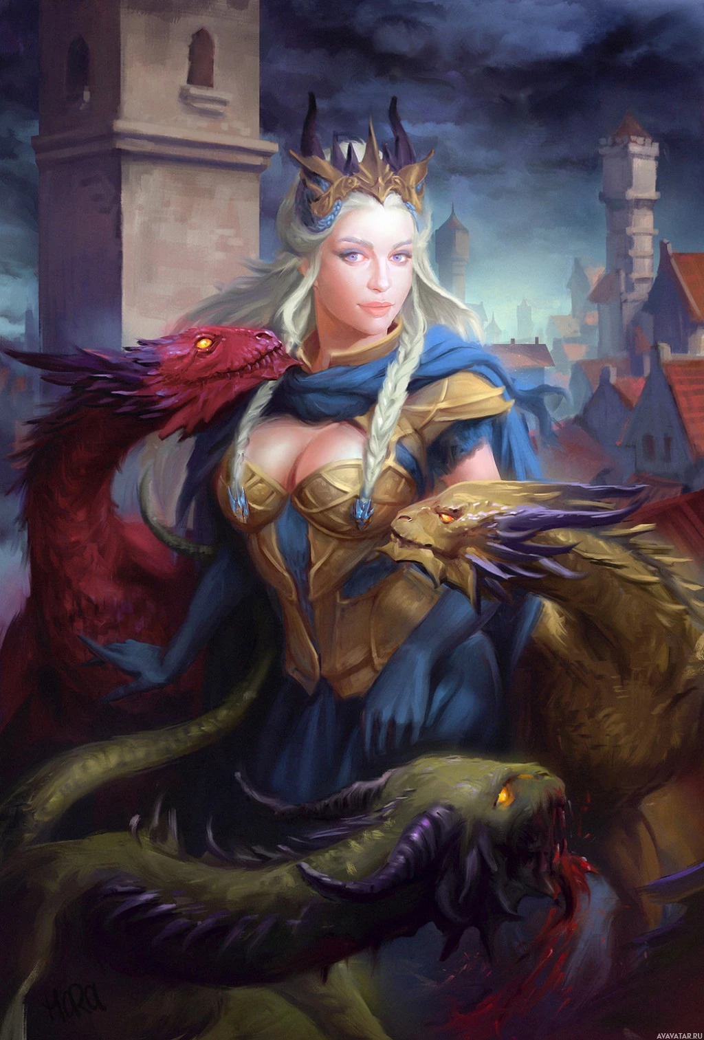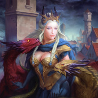 blonde hair and a regal demeanor. She is wearing armor that appears to be inspired by Norse or Viking designs, suggesting she may be associated with dragons in this