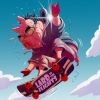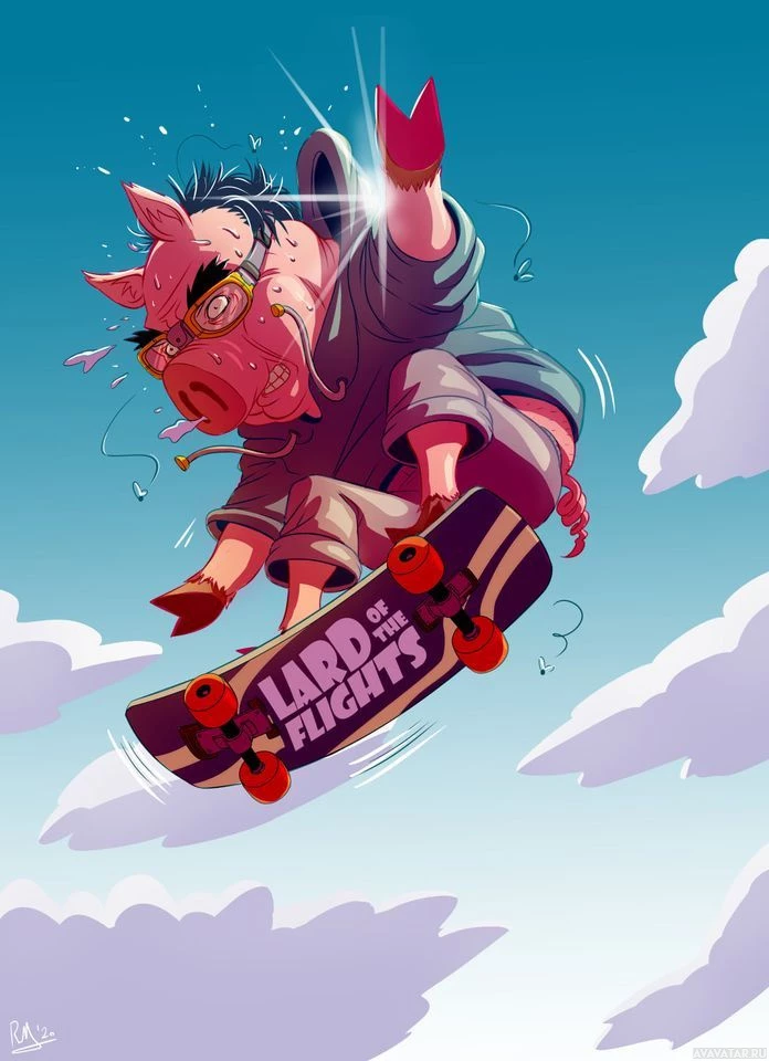 The image shows a cartoon-style illustration of a pig skateboarding in mid-air. It appears to be