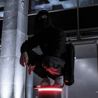 a dark hoodie with the hood up, obscuring their face and head. They are crouched down on one leg, resting their hand on their knee, giving off a relaxed yet poised stance. In the background, there's a red object that could be part of