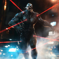 a dramatic pose with his arms outstretched, surrounded by red beams that create an effect similar to the Spider-Verse. The setting looks like