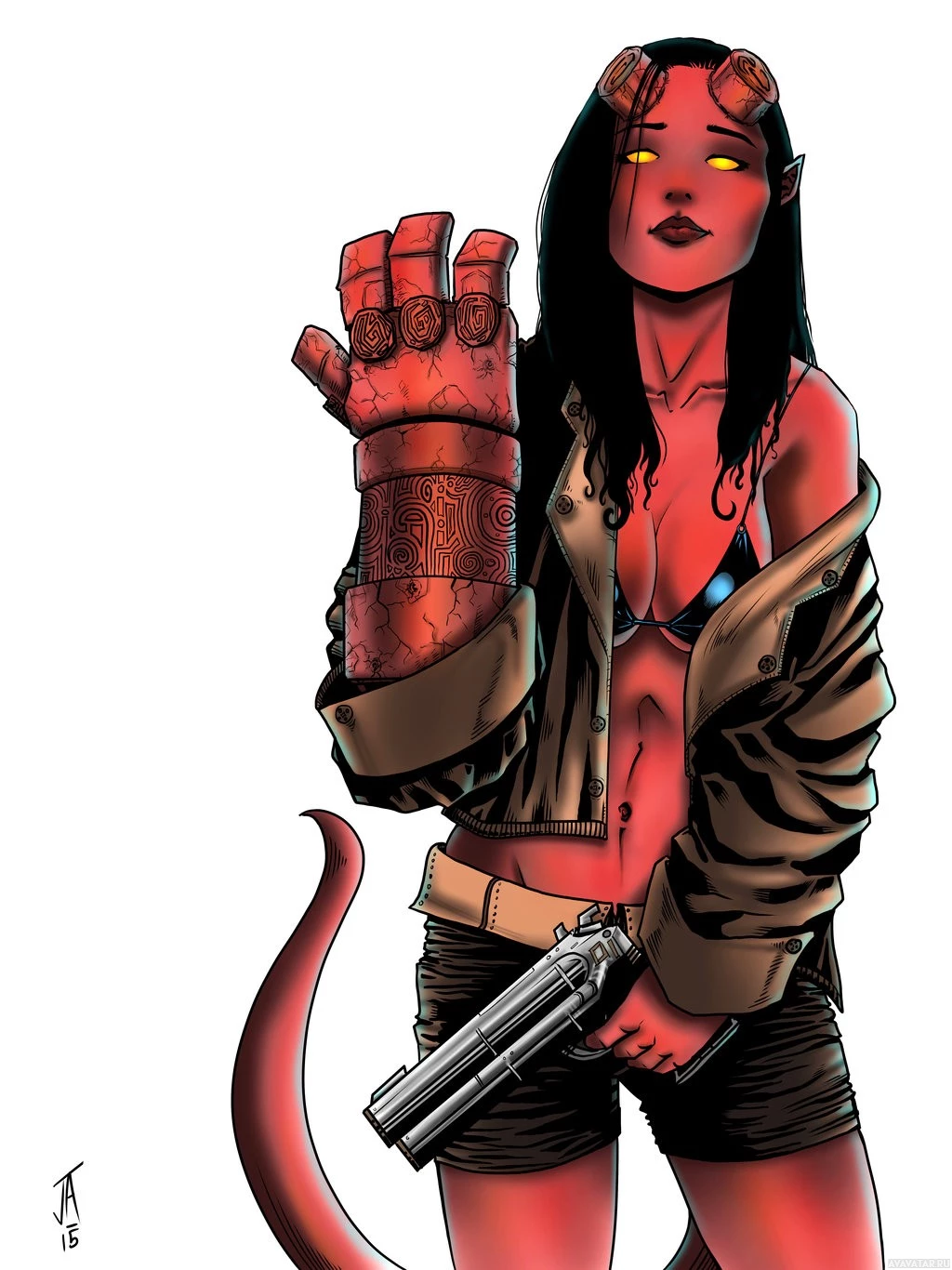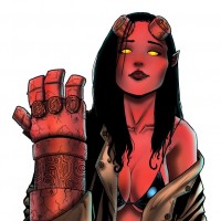 The image depicts a stylized character who appears to be an adaptation of a Hellgirl, typically associated with the comic