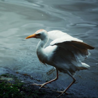 calm water with ripples, indicating stillness, which contrasts with the movement suggested by the bird's pose.