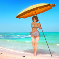 The image depicts an animated character, a young woman with a bikini top and shorts. She is standing on a beach with her hand on an orange sun umbrella. The background shows a clear blue sky and the ocean, suggesting a tropical or coastal setting.