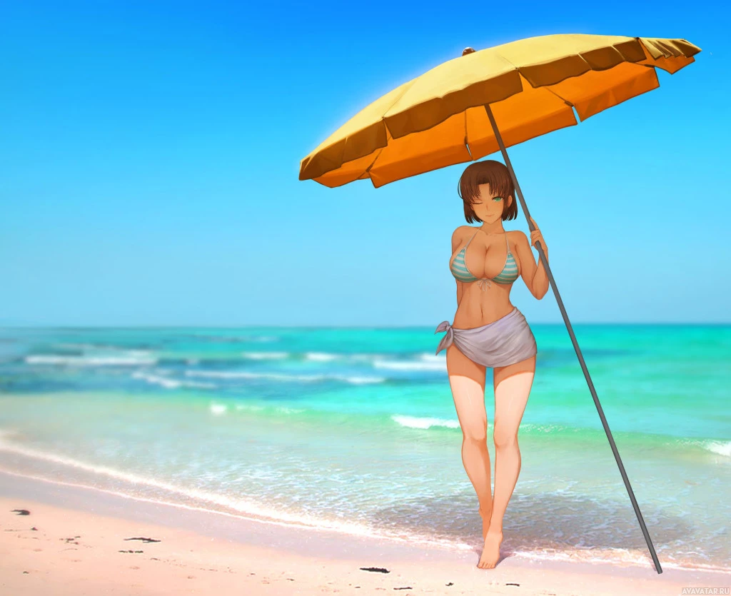 На картинке изображен анимированный персонаж, молодая женщина с бикини-топом и шортами. Она стоит на пляже с рукой на зонтике с оранжевым солнцем. На заднем плане видно ясное голубое небо и океан, что указывает на тропическую или прибрежную обстановку.