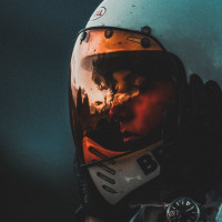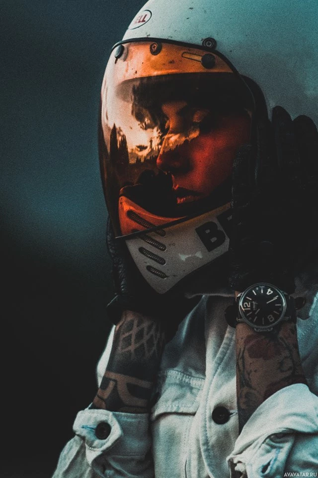light sources reflecting off surfaces. The person's face is not visible through the helmet visor, adding