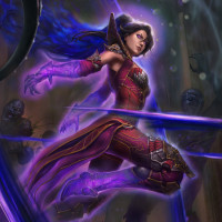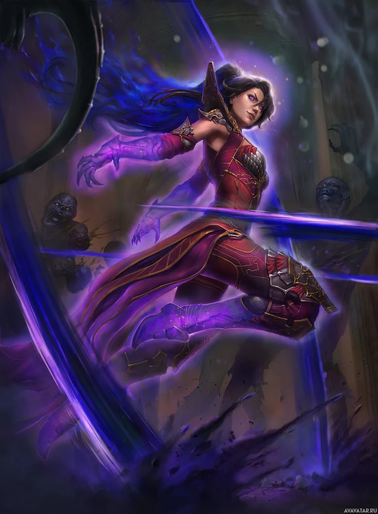 magical abilities or is engaged in a battle with mystical elements. Her sword is drawn back, indicating readiness for combat. The background is dark and ominous, with what appears to be a portal or gateway looming behind her, which adds to the fantastical theme of the image.