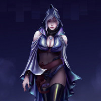 a serious expression on her face and is standing against a dark background that seems to feature pixelated or grid-like shapes. The overall tone of the image suggests a fantasy or gothic theme, possibly indicating a character from a role-playing game or
