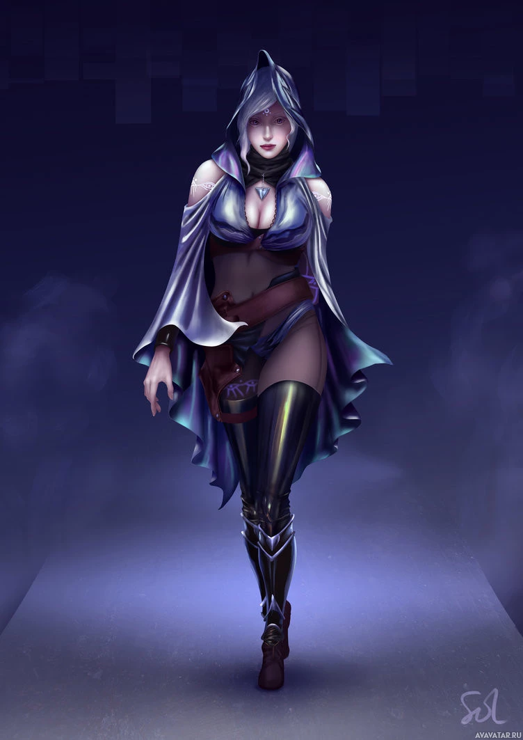 a female figure wearing a hooded cloak and leather-like attire, with dark elements like a cape and what appears to be armor. She has