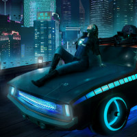 futuristic car with neon accents and cyberpunk aesthetics. The individual appears to be wearing a helmet or