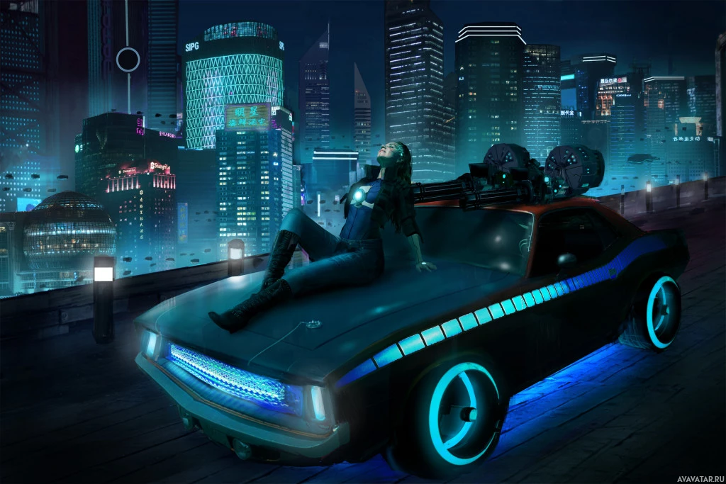 a futuristic setting at night. In the foreground, there is a person sitting on the hood of an old, retro-
