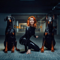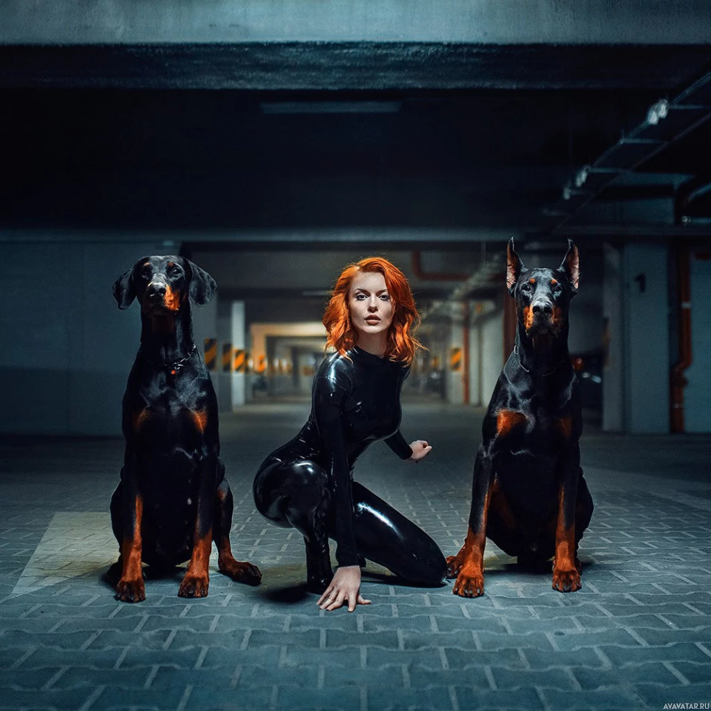 red hair sitting between two Doberman dogs. She is wearing tight, shiny black clothing that resembles body armor or