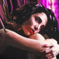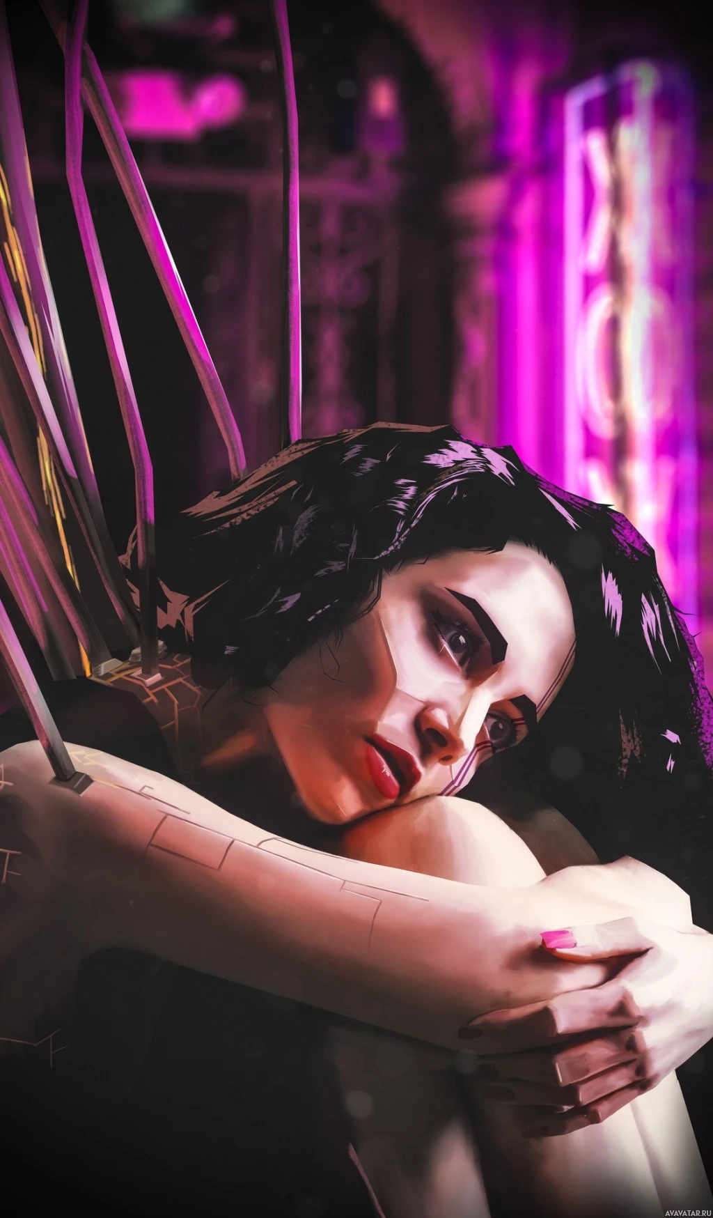 a science fiction setting, indicated by the futuristic background that includes neon lights and intricate details suggesting a cyberpunk or advanced technology theme. The character's expression and posture give her an intense and thoughtful appearance.
