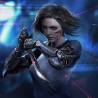 a science fiction style. The character is shown holding a knife and appears to be in a battle or intense situation, as indicated by