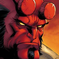 book series. The background suggests a fiery, possibly hellish environment, which aligns with Hellboy's