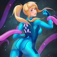 purple tentacles reaching out towards her back, a common element in the "Metroid" games. The artwork captures the iconic design of Samus Aran with