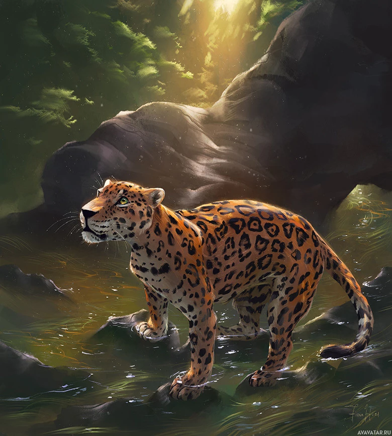 На картинке изображен ягуар, стоящий на скалах в лесной местности. Ягуар имеет отличительные отметины с рисунком темных пятен на более светлом фоне, что характерно для вида. Окружающая среда предполагает, что он может находиться в естественной среде обитания или в хорошо спроектированном зоопарке.