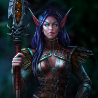 a formidable character. The background gives an impression of a mystical or otherworldly environment, fitting the fantasy theme of the image.