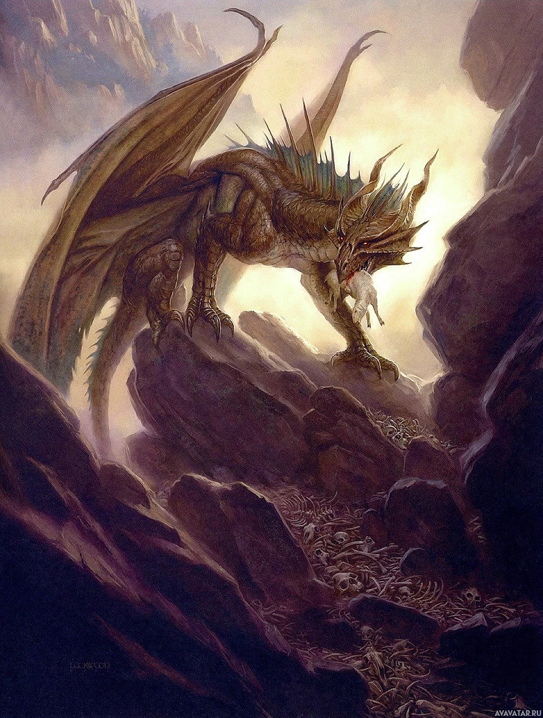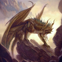 fantasy literature, often characterized by wings and a fiery appearance. In this particular illustration, the dragon appears to be perched on rocks or cliffs, possibly overlooking a landscape that could be part of a larger story or setting in a fantasy context.