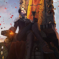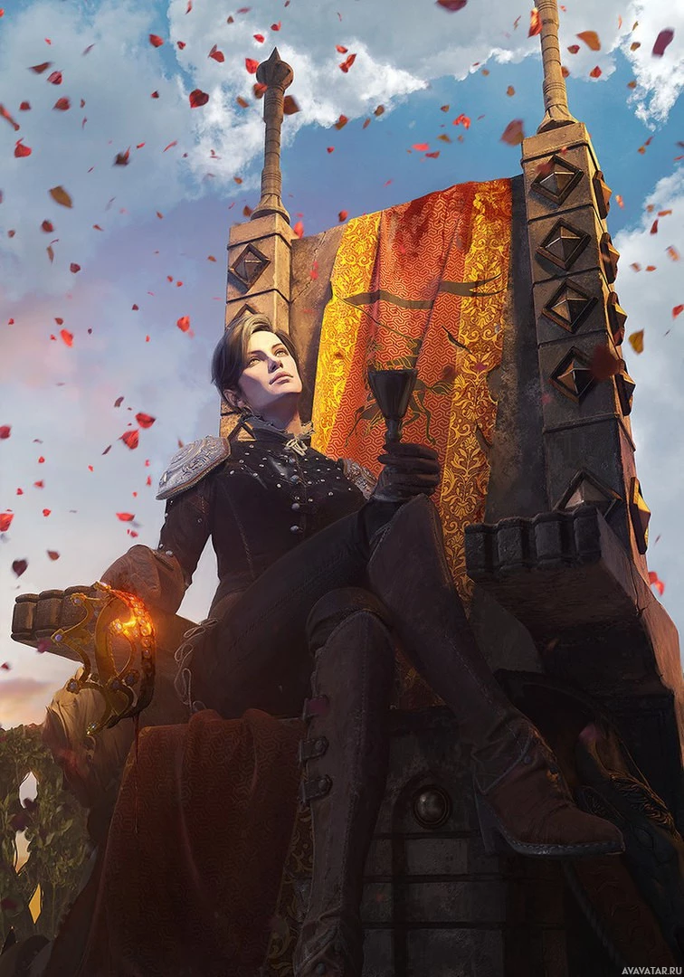 an ornate throne, holding what appears to be a sword or staff in their right hand and a goblet in their left. They are wearing armor and a cape that adds to the regal and fantasy-like appearance of the scene. The background suggests