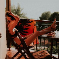 The image shows a person sitting on a balcony with their legs raised up towards the sky. They are wearing what appears to be a bikini and sunglasses, suggesting it might be
