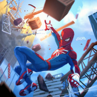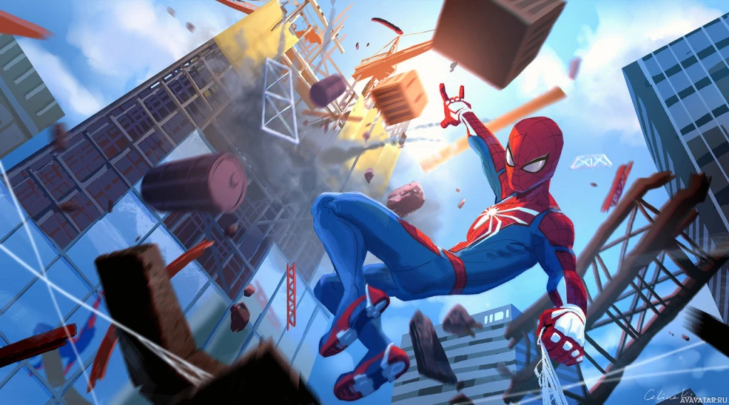 scenes of destruction, possibly indicating a battle or conflict taking place. There are also various other elements such as buildings and debris flying around, suggesting that Spider-Man is in the midst of saving the day or engaging in combat with a villain. The image has