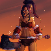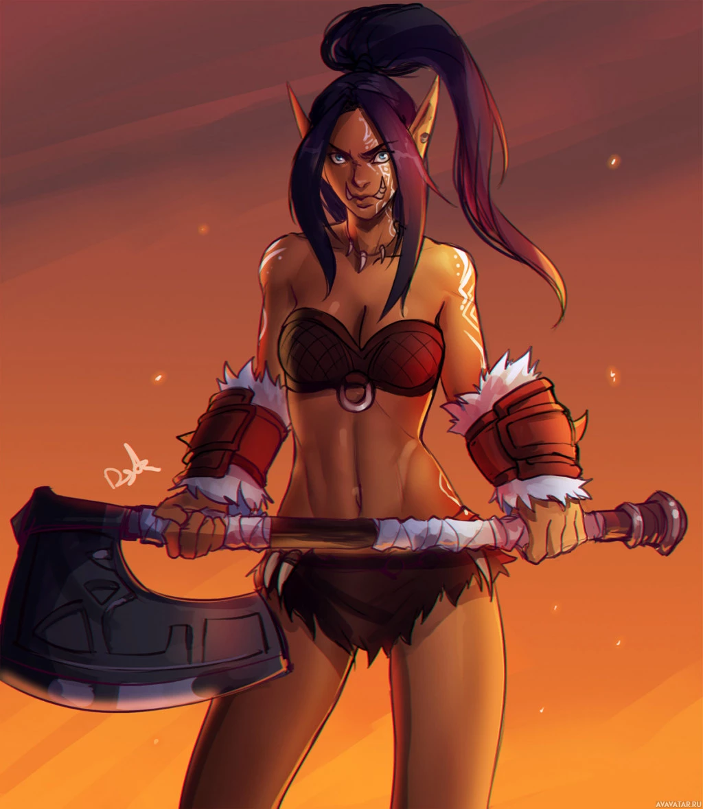 an illustrated character who appears to be a female orc. She has dark hair, tattoos on her arms, and is wearing a revealing outfit that resembles