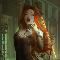 red hair styled upwards and is wearing a dark corset top with a garment that could be interpreted as vampire-inspired attire due to the pale skin tone and possibly sharp fangs, which are not visible in this image. She is holding what seems to be a sword or dagger in her right hand and has her left hand on her hip. Her posture and expression suggest she might be preparing for combat or making an exclamation. The overall atmosphere of the image conveys