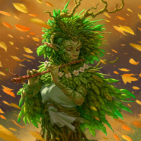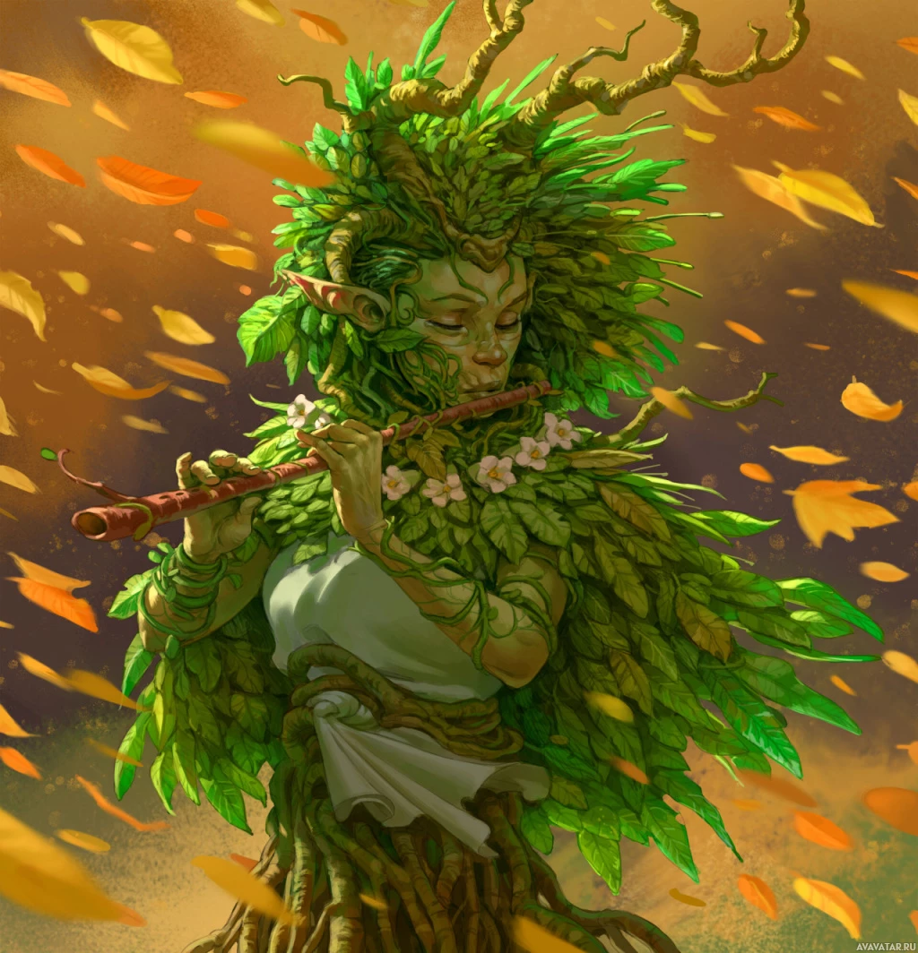 a mythological being associated with trees or forests. The character is playing a flute, suggesting they might be depicted as someone who brings life to the forest through their music. The background features