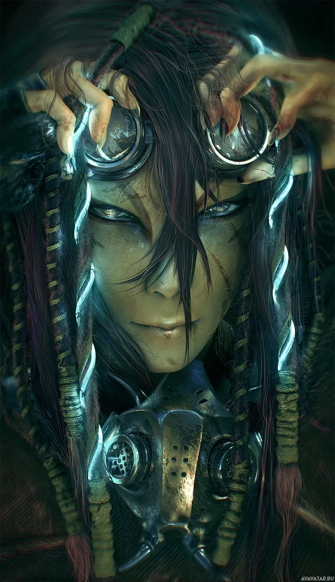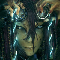 dark hair with some strands falling over their face. They are wearing a pair of glasses perched on the tip of their nose and have an intricate headdress adorned with what seems to be
