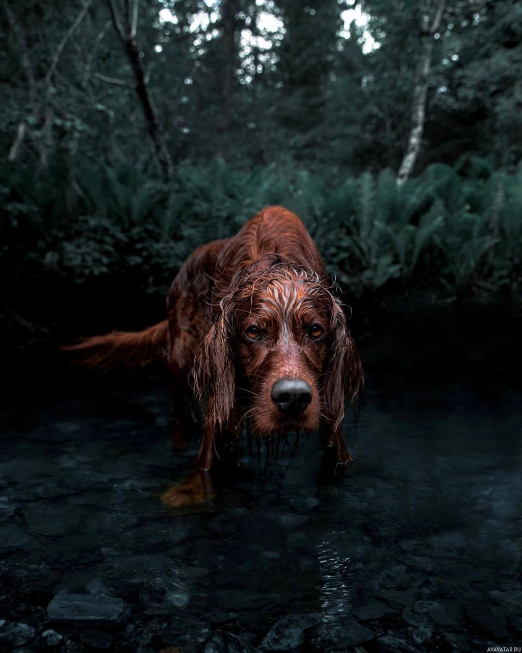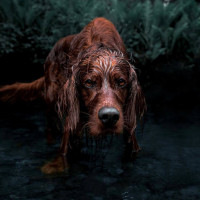 a natural setting, likely a forest or woods. The dog appears to be wet, possibly having been in the water, and is looking towards the camera with its head slightly tilted. It's