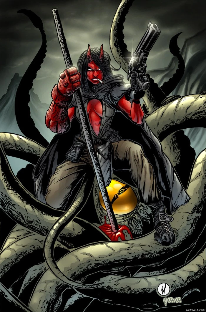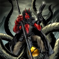 a powerful shout or casting a spell. The character has red skin and horns, which are common attributes for demons or supernatural beings in various mythologies and