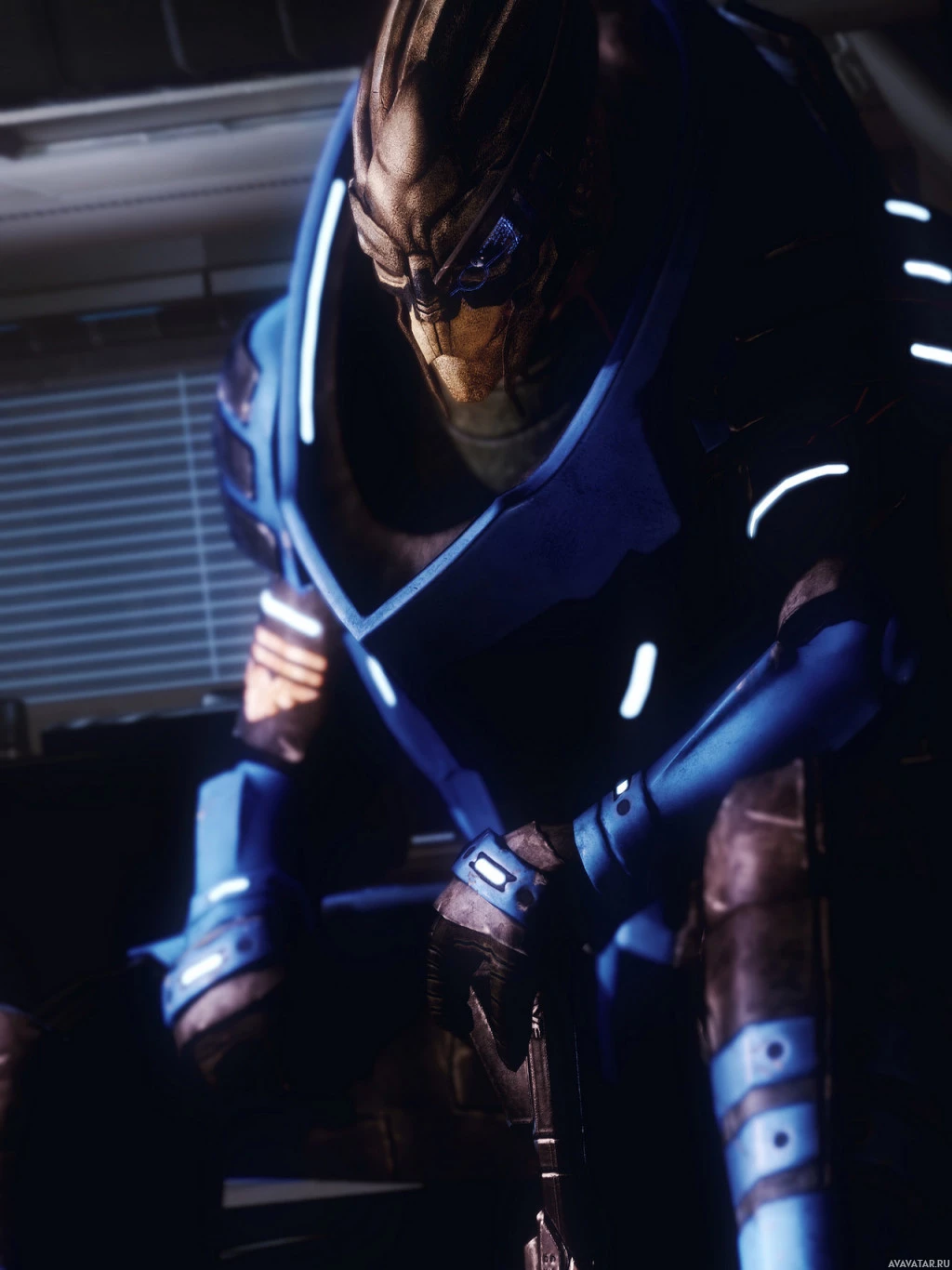 blue skin and antennae, which are characteristic features of her species. Tali is wearing a suit that is typical for Quarians, designed to protect them from