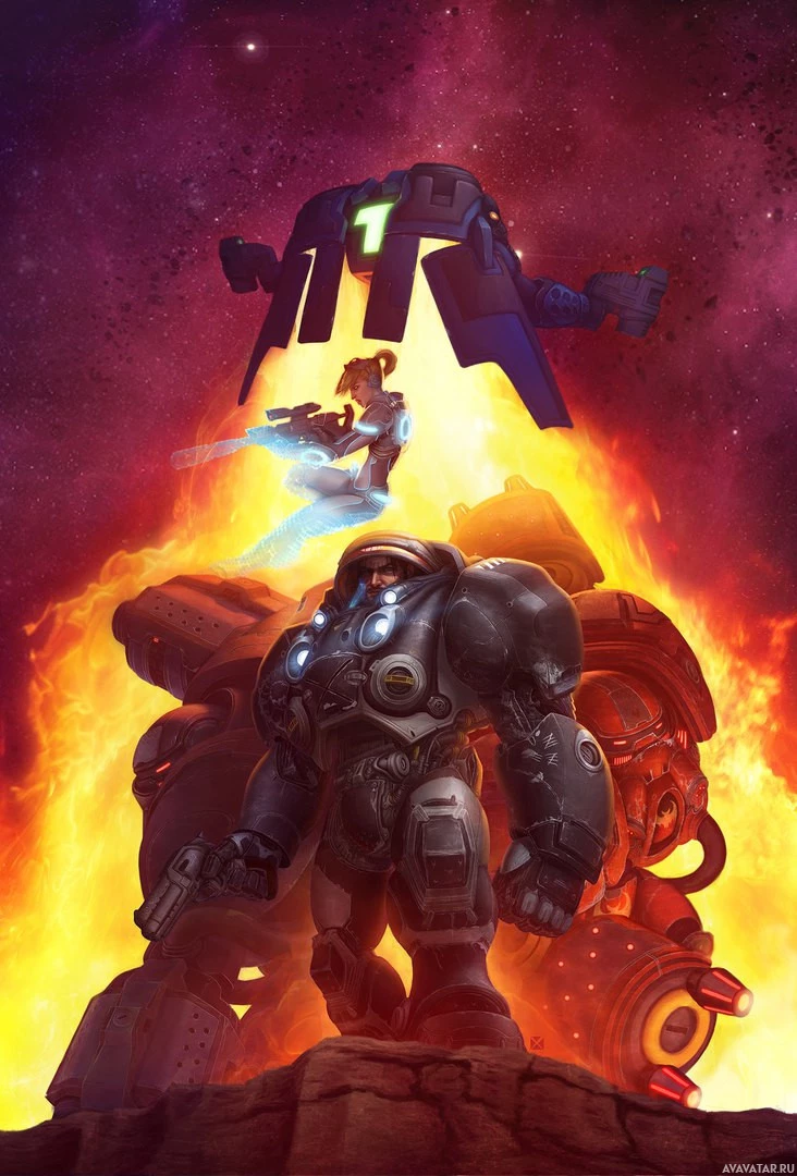 a terran character and a key protagonist in the game's narrative. They are positioned in front of an explosion that suggests some sort of conflict or battle scene, which is fitting given the nature of the game as a real-time