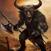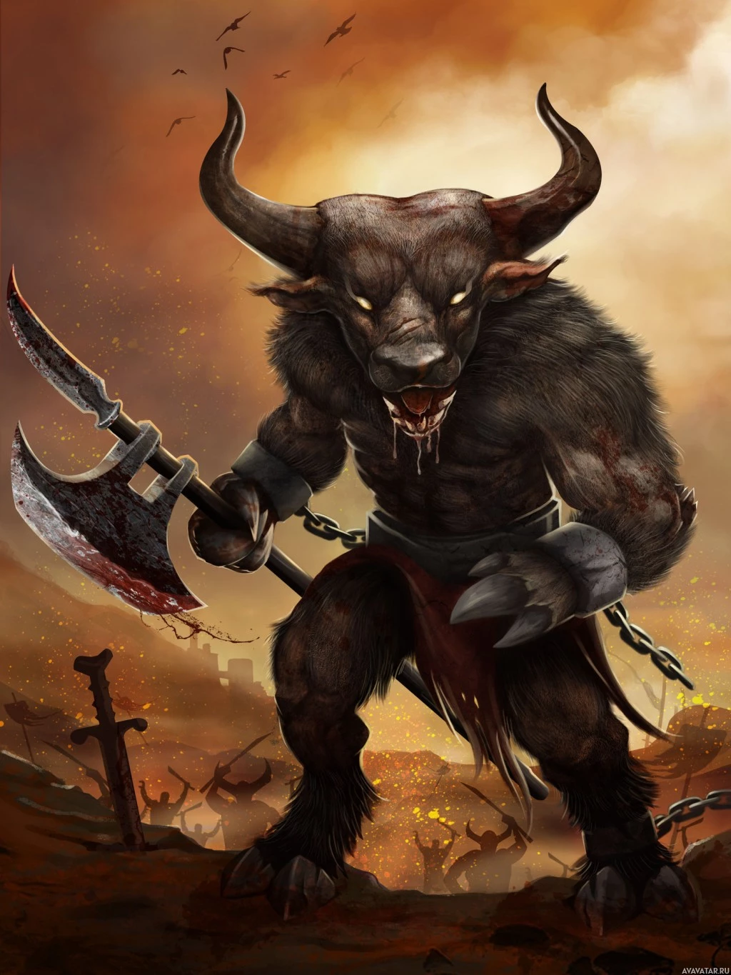 a fantasy creature, commonly referred to as a minotaur. It has the body of a bull with