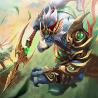 a dynamic pose, holding what looks like a weapon with magical energy or light emanating from it. The background suggests a fantasy setting with elements of nature and possibly a battle or adventure theme. The character is known as