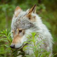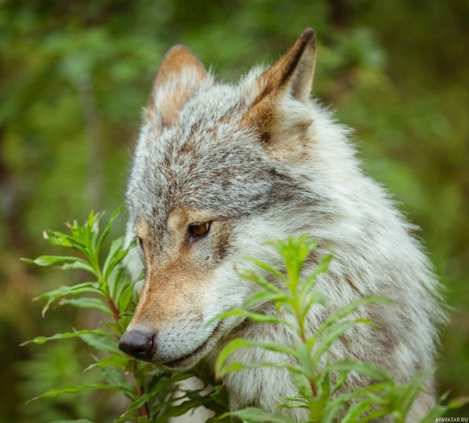 Это изображение показывает волка в его естественной среде обитания. Волк стоит среди какой-то растительности, листва частично заслоняет лицо. Его уши направлены вперед, и кажется, что он нюхает воздух или, возможно, исследует что-то в растениях вокруг него.