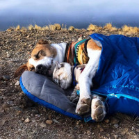 mountains in the background. The dog appears to be a breed with brown and white fur, and it is lying down comfortably on the tent, which suggests that this might have been