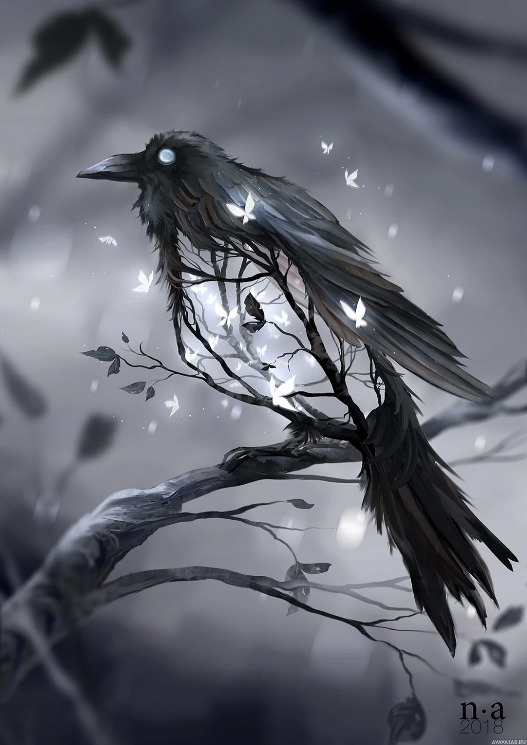 The image features a fantasy-themed depiction of a bird, specifically a crow or raven. The bird is perched on a branch that has leaves and what appears to be glowing berries or fruits. The background consists of dark, misty elements which give